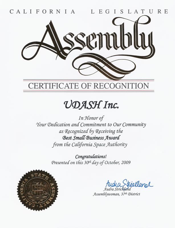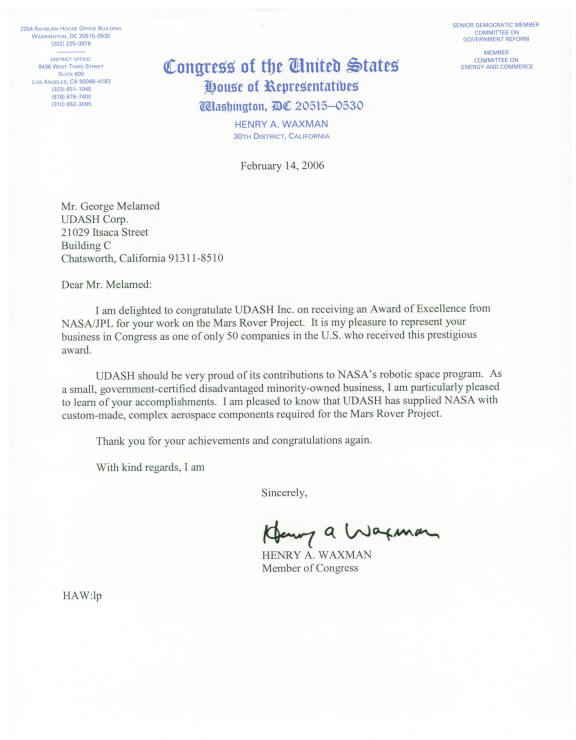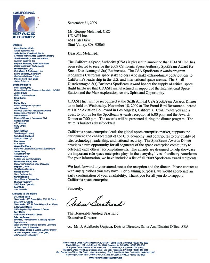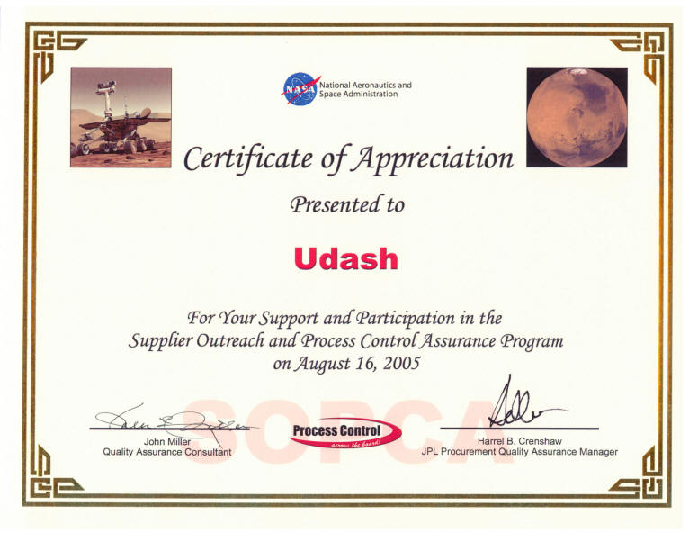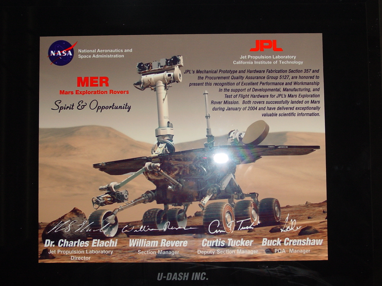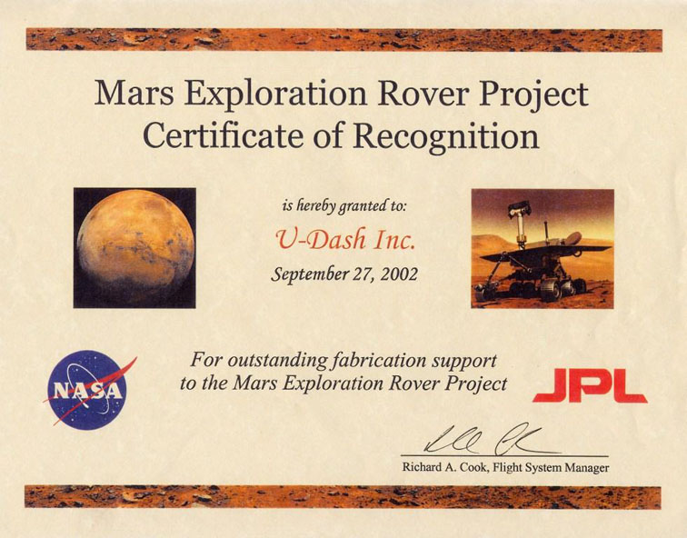 Moreover, NASA’s Jet Propulsion Laboratory (JPL) has twice awarded UDASH their prestigious national awards for excellence in many parts produced for the various Mars Exploration Rover projects. We at UDASH were honored to receive such unique awards only given to a limited group of NASA suppliers for having consistently manufactured high quality components, with on time delivery and competitive pricing. Still after many years, the manufacturing team at UDASH are quite proud of being a part of such a major human scientific space endeavor related to exploration of the planet Mars! Likewise, in the past we have received the Best Small Business Award from the California Space Authority for countless parts we have successfully produced for the space and satellite industry over the years.